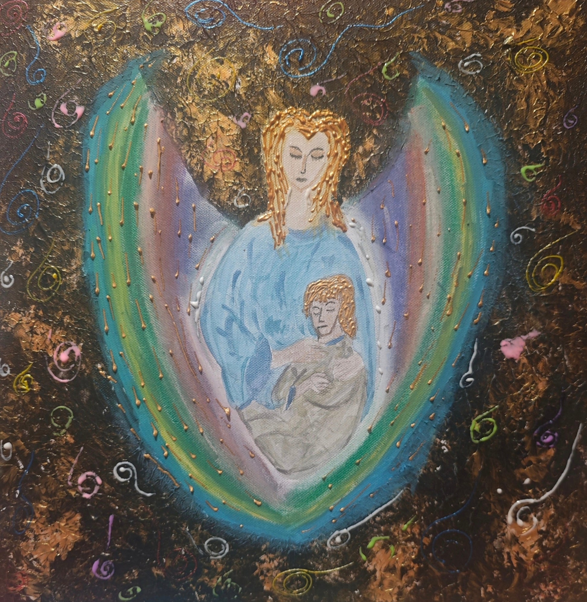 Quest’opera nasce come un grembo di luce sacra. Le ali arcobaleno che si aprono attorno alla figura centrale creano un campo protettivo straordinario, una cupola energetica dove le frequenze dei sette arcangeli si uniscono in un unico movimento armonico. Ogni colore porta una qualità: guarigione, forza, verità, rinascita, amore, intuizione, guida. Tutte attraversano l’immagine come un canto corale.