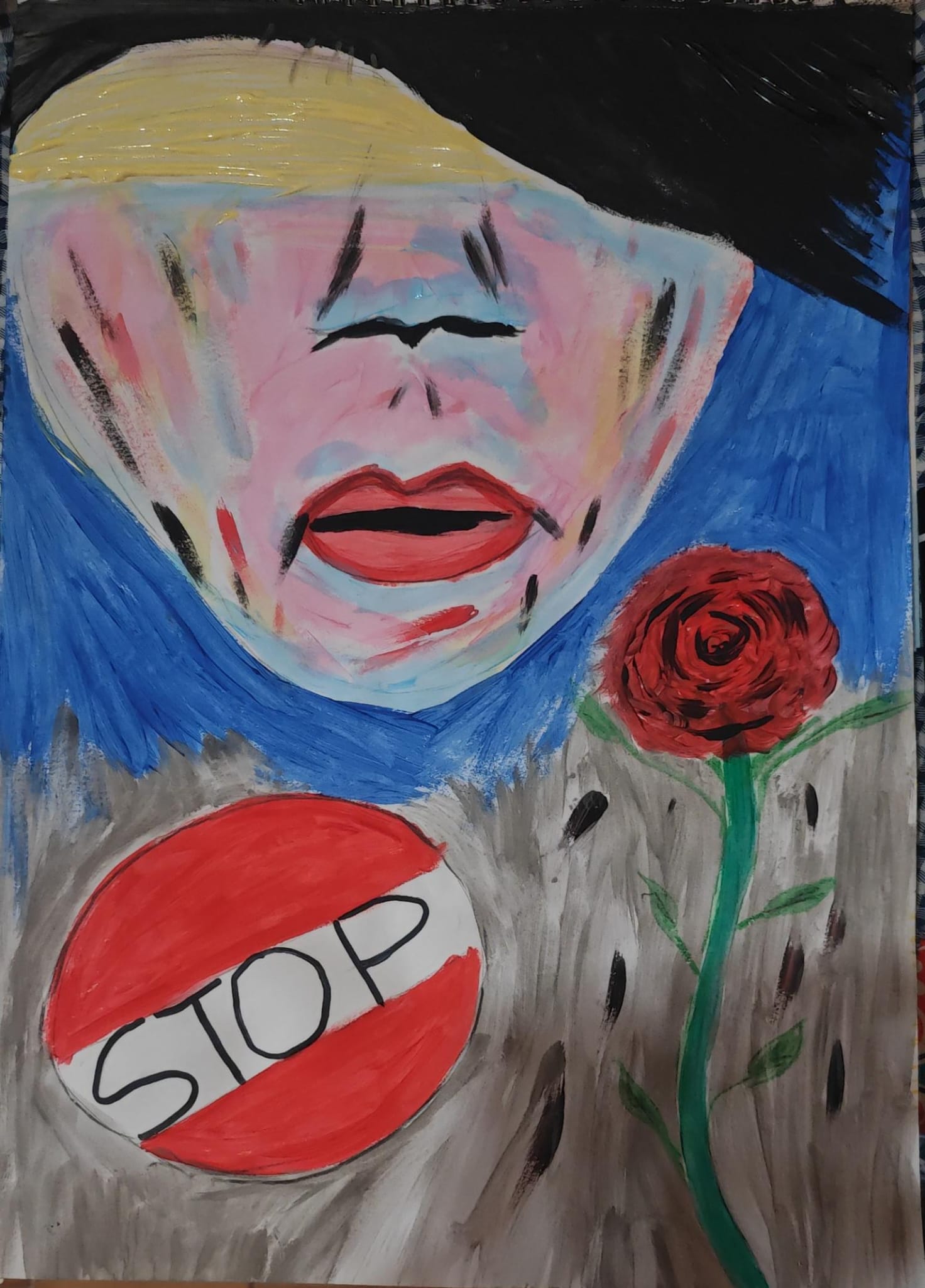 Sotto il volto, la rosa rossa cresce come un simbolo di dignità e coraggio: un fiore che si afferma anche in un terreno difficile, portando bellezza, vita e valore.