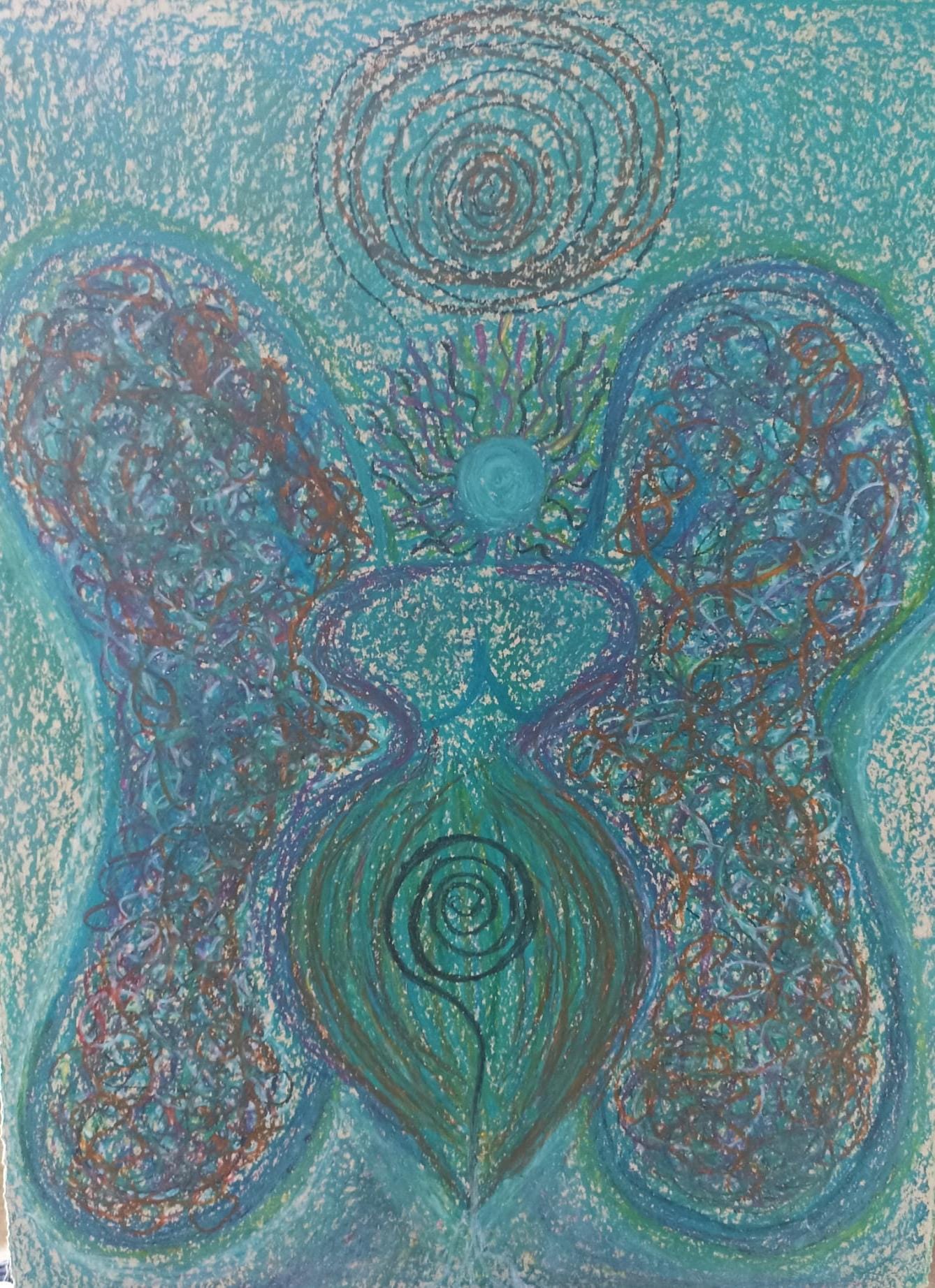 La figura centrale si apre come un essere di luce: ali ampie, linee morbide, un cuore energetico che pulsa al centro. I toni dell’azzurro e del verde avvolgono l’intera scena con una vibrazione di guarigione e protezione.