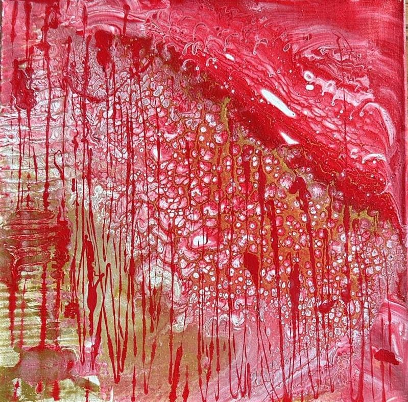 L’opera pulsa di un rosso vivo, stratificato, che scende in rivoli come un racconto antico. Ogni colatura sembra un’emozione che si scioglie, una memoria che affiora alla superficie per trasformarsi. Il colore si muove come un respiro caldo, avvolge, attraversa, apre spiragli di luce tra le sue trame.