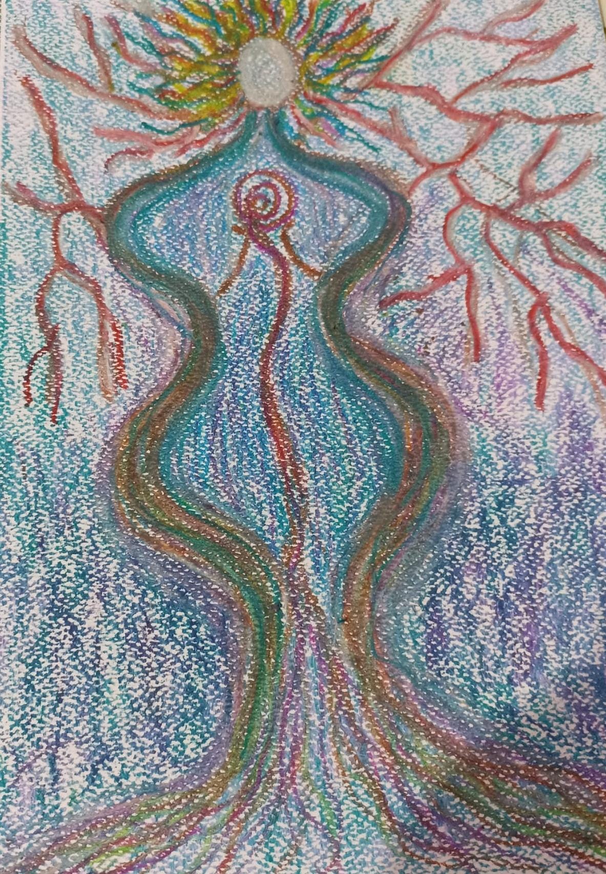La figura centrale si innalza come una sacerdotessa della vita: corpo fluido, radicato nella terra e aperto verso il cielo. Le sue linee sinuose scorrono come fili energetici che intrecciano destini, memorie, percorsi.