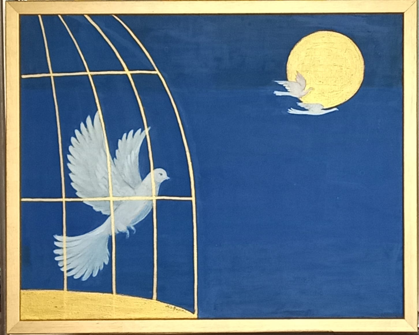 La colomba sulla sinistra, ancora vicina alla gabbia dorata, porta con sé la memoria del limite; la colomba che vola verso la luna è la direzione nuova, la scelta, la strada aperta.